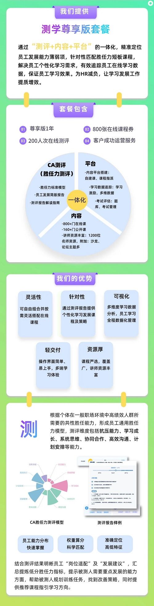 为此,肯耐珂萨学习云近期推出测学尊享版套餐,通过“测评+内容+平台”一体化,解决企业面临的诸多学习发展方面的问题: